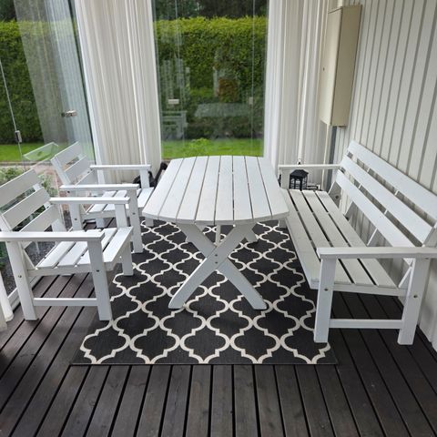 Sohva ja kaksi nojatuolia sekä pöytä lasilla. Tuoleihin löytyy harmahtavat ohuet pehmusteet. Käytönjälkeä on, eivät ole uudet. Omasta mielestä kuitenkin siistit.