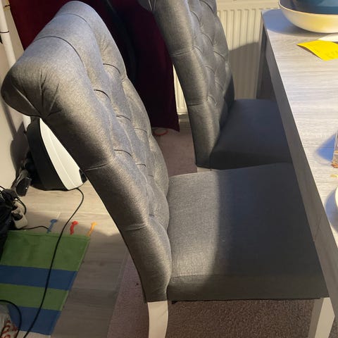 Täyspuuta. Käytönjälkiä, mutta kaikki ehjiä. Tuolit helppo päällystää uudestaan.