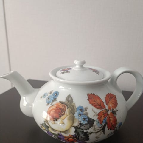 Pieni, sininen emalisanko, kahvassa puuosa. Korkeus 13,5 cm ja ympärys levein kohta 16,5 cm, kapein kohta 12 cm. Nouto Savolanniemi.