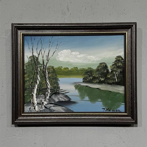 Kaunis öljyvärimaalaus, joka esittää rauhallista järvimaisemaa. Teos on kehystetty tummilla puukehyksillä, jotka korostavat maalauksen luonnonläheisiä sävyjä. Signeerattu T Koivula