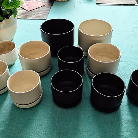 Myytävänä yhteishintaan 4 kpl Arabian SN-mallisia mustia kukkaruukkuja. Ruukkujen korkeus aluslautasen kanssa on 9,5 cm ja halkaisija 11,5 cm. Yhteishinta on 60 €, yksittäin ostettuna 18 € kpl.