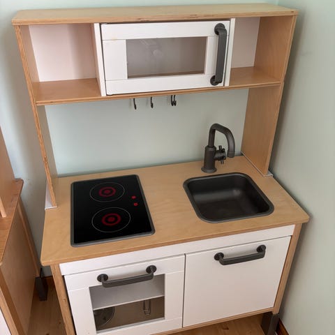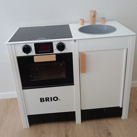 Ihana ja kaunis kaksiosainen lasten leikkikeittiö. Hanan napit ja hellan napit pyörii. Jääkaapin oven alaosassa ja tiskialtaan alla olevassa kaapissa jälkiä tarroista / kulumaa, jotka erottaa jos katsoo aivan läheltä hyvässä valossa. Ei vaikuta leikkeihin : )