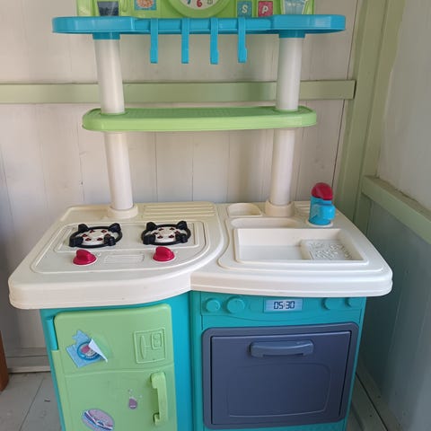 Ikean expedit -hyllyyn tuunattu leikkikeittiö. Elämää nähnyt, mutta ihan toimiva. Tarrat saanee irti rapsuttamalla ja tarranpoistajalla.