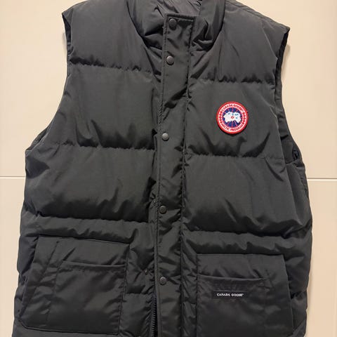 Canada Goose tummansininen liivi. Fleecemäinen lämmin vuori. Kokomerkintä XL, mutta sopii hyvin M tai S kokoisille. Pituus 69 cm, leveys kainaloista n. 55 cm.