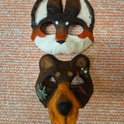 Kaksi itse tehtyä therian maskia myynnissä; karhu ja susi. Maskit maksavat 15€/kappale. Postitus onnistuu, postituksen hinta 10€.