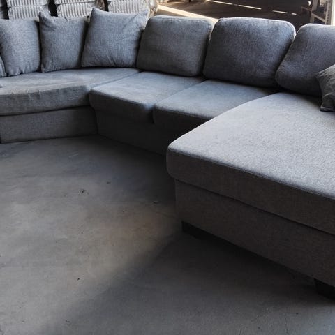 Harmaa kulmasohva. Pitkä sivu 275 cm ja lyhyempi 245 cm. Hyvässä kunnossa ja päälliset pesty. Runko menee kolmeen osaan. Ollut eläintaloudessa.