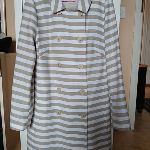 Hyväkuntoinen ruskea MasCaran lyhyt trenssitakki. Koko 38. Taskut edessä. Vyölenkit ja vyö. Vyönsoljesta irronnut kieli(piikki). Kai-kai 51 cm. Pituus n. 83 cm. Päällinen puuvillaa ja vuori polyesteriä.