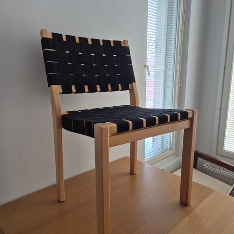 Kaksi vanhaa Artekin 611 -tuolia. Koivua, vyöt luonnonväristä pellavaa.