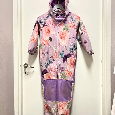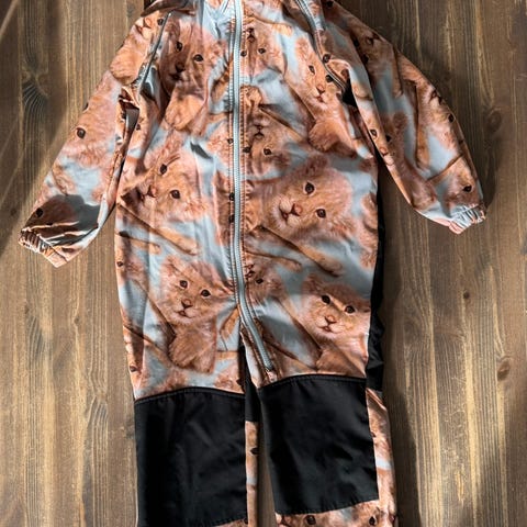 Ihana eläinkuosinen softshell haalari. Polvissa ja pepussa pehmentymää, ripustuslenkki katkennut. Jalkalenksuja ei ole, napit lenksuille paikallaan. Tästä vielä oikein hyvä haalari seuraavalle.