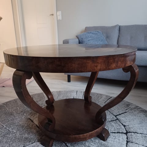 Täysipuinen sohvapöytä, pinta voi kaivata hieman hiomista, mutta hyvässä kunnossa kuitenkin. Koko 87x87cm