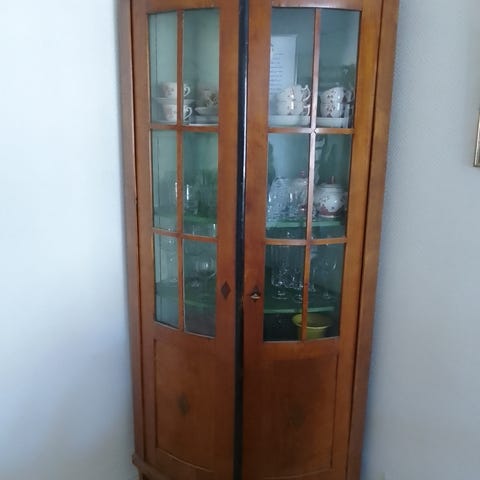 Vanha, tukeva vitriinikaappi. Lasit puhallettua lasia. Kaapin yläosa ei ole irroitettavissa. Alakaapeista puuttuu helat avaimen reikien ympäriltä.