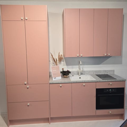 Harmaa ovinen, ruskea viilu laminaattityötasolla oleva malliryhmä.