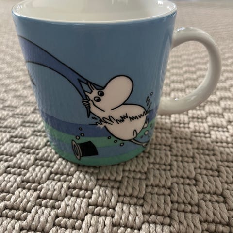 Vitriinissä säilytetty delfiinisukellus muumimuki.