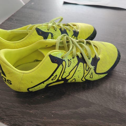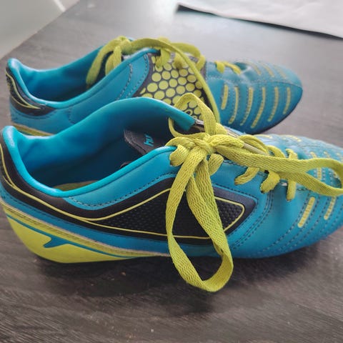 Mitre jalkapallokengät, väri sininen–keltainen. Nauhallinen malli. Muuten ehjät mutta värit kuluneet kuten kuvasta näkyy. Koko 36