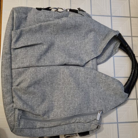 Gesslein hoitolaukku. Ei enää uusi, mutta ehjä ja siisti. Tarralenkit joilla saa kiinnitettyä vaunujen työntöaisaan. Tilava ja useampi tasku ja sisällä lokerot joiden avulla saa tavarat järjestykseen.