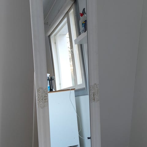 Myydään vanha vaatekaupan peili. Peili on hyvässä kunnossa, ja sen takaosasta löytyy paikat jykevää seinäkiinnitystä varten. Peili on painava, joten se pysyy myös hyvin nojassa seinää vasten, miten olen sitä itse käyttänyt.