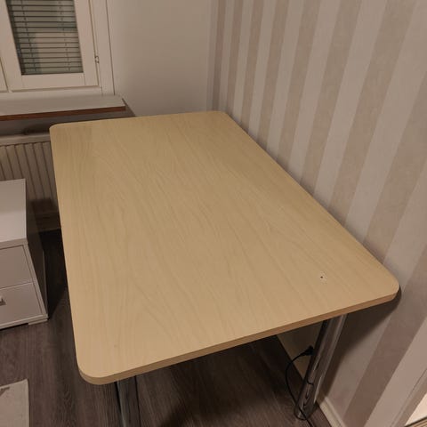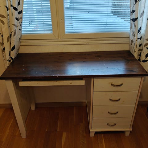 Annetaan meikkipöytä joka on meillä ajanut meikkipöydän ja tietokonepöydän virkaa.Uusihan tämä ei ole,iso ovisesta laatikosta puuttuu takalevy ja muutama puutappeja puuttuu osista mutta sen saa kasattua kuitenki .Kannettava osissa ja putsaus jää hakijalle