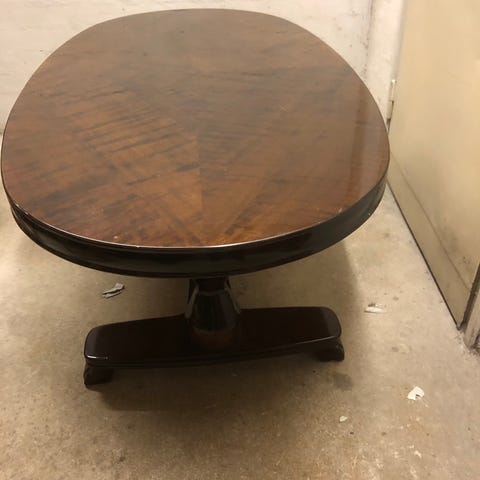 Valkolakattu puukantinen pöytä metallijaloilla. Hyväkuntoinen.