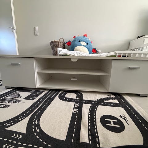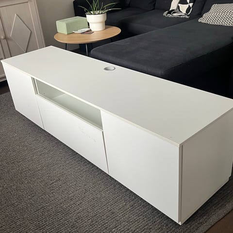 Hyvässä kunnossa oleva tv-taso kahdella vetolaatikolla.
