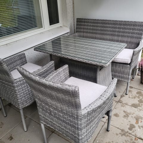 Polyrottinkinen ulkosohva, 2 tuolia ja sohvapöytä lasikannella. Väri musta. Sohvassa korkea selkänoja ja käsinojat molemmin puolin. Sohvapöydässä alataso säilytykseen ja päällä irrotettava lasikansi. Sopii terassille, parvekkeelle tai puutarhaan ulkokalustesetiksi.
