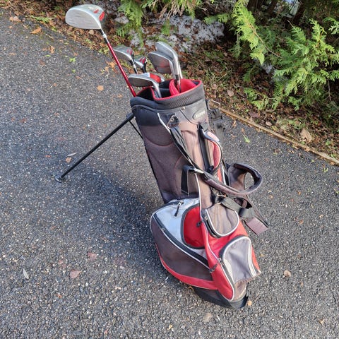 Faith golfbägi ja mailasetti jalustalla. Kevyt stand-bägi, jossa kaksijalkainen jalusta, kantoviilekkeet ja useita vetoketjullisia taskuja. Väri musta–punainen. Setissä useita rautamailoja, puumailoja sekä putteri, mailoissa seka eri merkkejä. Sopii täysikokoiseksi setiksi aikuiselle pelaajalle harjoitteluun ja kierroksille.