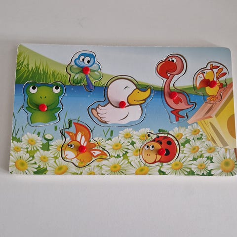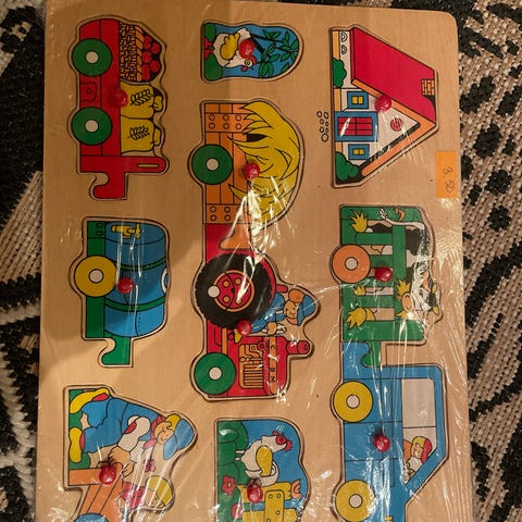 Myydään puinen nuppipalapeli, erilaisia ajoneuvoja. Pelailtu, mutta edelleen kelpo palapeli.