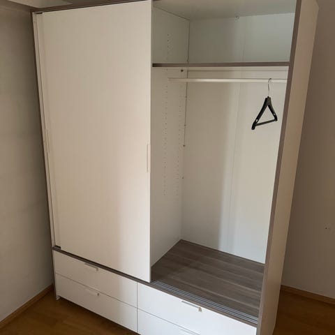 Valkoinen kaappi, jossa 2 hyllylevyä ja 4 vetolaatikkoa. Mukaan myös tanko, jolloin vaatteita saa myös ripustettua roikkumaan.