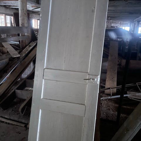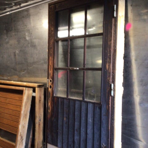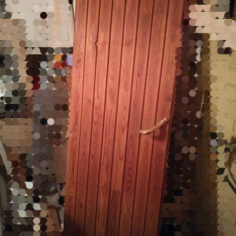 Puuovi, jossa useita lasiruutuja. Sopii esimerkiksi sisä- tai varasto-oveksi tai muuhun rakennus- ja remontointikäyttöön. Materiaalina puu ja lasi.