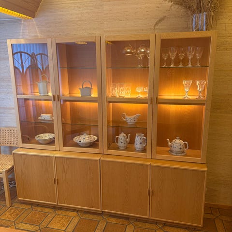 Klassinen iso vintage vitriinikaappi, joka tarjoaa runsaasti säilytystilaa esimerkiksi astioille.