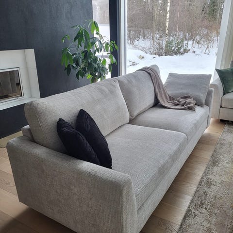 Myydään luonnonvalkoinen/kitin/vaalean beigen värinen erittäin siistikuntoinen 3-hengen sohva. Sohva on ehjä, tahraton sekä jämäkkä ja tukeva istua. Yksi istuintyynynpäällinen uusittu huonekaluverhoilijan toimesta (nestevahinko lapsella). Sohvaan on suihkutettu tekstiilisuoja. Ei eläimiä. Tästä oikein hyvä sohva seuraavalle. Koristetyynyt eivät kuulu kauppaan.