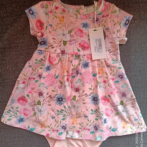 Neulemekko vauvalle, koko n.86. Vaaleanpunainen akryylineule, jossa valkoinen neulottu kaulus ja edessä kirjailtu kuvio. Pitkät hihat ja nyörikiristys vyötäröllä. Takana nappikiinnitys helpottamassa pukemista.