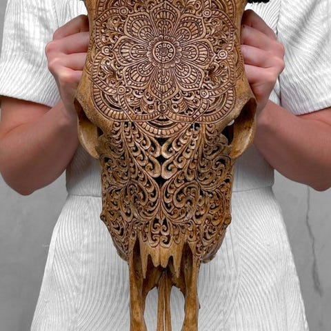 EI VARAUSHINTAA -C- Harmaa kaiverrettu naudan pääkallo boheemisilla