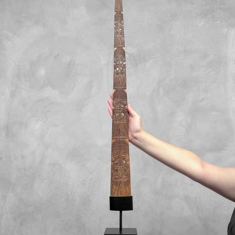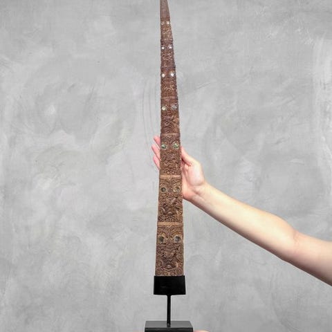 Tämä miekkakala-nokka on veistetty käsin perinteisellä maori-kuviolla.Käsin veistetty miekkakala-tuska perinteisellä maori Wheku ja Tiki -kaiverruksella. Wheku, merkitykseltään 'veistetut kasvot', esittää esi-isän kasvot. Wheku sijaitsee yleensä Wharenuin, maorien kokoontumistalon, huipulla ja symboloi merkittävää esi-isää, jonka mukaan talo on nimetty. Tämän maorin silmät on koristeltu abalone-kuorilla, lisäten vaikuttavan yksityiskohdan ja kunnioittaen maorin perinnettä.NOIN MITAT INCLUDING STANDKorkeus: 78 cmVAROITUKSET- Koska kyseessä on luonnollinen tuksi, siinä voi olla pieniä halkeamia ja uurteita. Tämä on normaalia. Katso kuvat.- Tukset on puhdistettu ammattimaisesti, mutta toisinaan hieman värimuutosta esiintyy. Tämä on luonnollista ja normaalia, eikä siihen ole paljon vaikutusta. Katso kuvat.- Yksi tai useampi kuva esittää tyyppiesimerkkiä vastaavasta esineestä. Myytävän esineen tarkat yksityiskohdat löytyvät muiden kuvien kautta. Tyylikuvaan sisältyy ei mukana myyntiin kuuluvia esineitä.- MAINITUN PAINON (WEIGHT) LÄHTÖINEN PAINEKOKO SISÄLTÄÄ PAKKAUSMATERIAALINLÄHETYS- Esine toimitetaan Tracking & Trace -koodilla DHL Parcelin, DPD:n tai PostNordin kautta. Seurantaluku päivitetään Catawikissa, kun pakettisi on jätetty varastoon.- Tarkista säännöllisesti, ettei pakettiasi palauteta meille, jolloin ostaja on vastuussa toisen lähetyksen kustannuksista.- Espanjan ja Portugalin seurannaksi käytä tätä linkkiä ja lisää Catawik-ostoksesi seurantanumerohttps://clientesparcel.dhl.es/LiveTracking/HomeEMME YHDISTÄ SIJOITUSTAAN!!!Jos sinulla on kysyttävää pakettisi suhteen, ota meihin yhteyttä Catawiki-viestipalvelun kautta. Pyrimme vastaamaan kolmen työpäivän kuluessa.