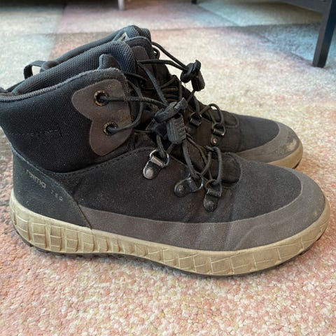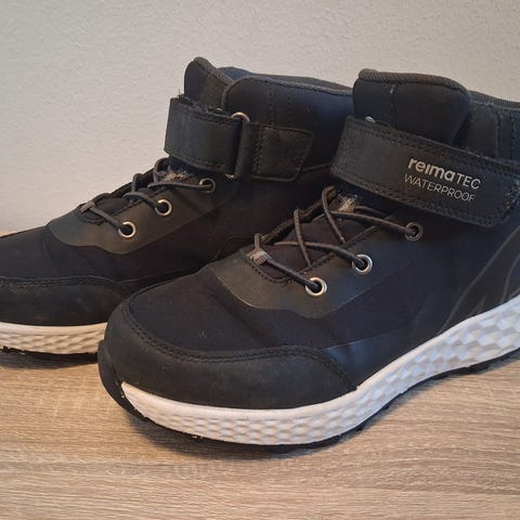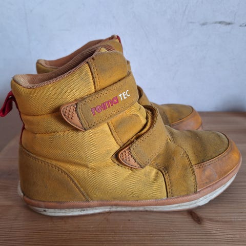 Reimatec välikausikengät, koko 34. Menevät pikku pakkasillakin. Yhden lapsen käytössä olleet, ns. parempina kenkinä. Päältä pyyhitty tahroja pois tarvittaessa, mutta ei ole pesty, joten teknisiä ominaisuuksia uskoisin olevan jäljellä.