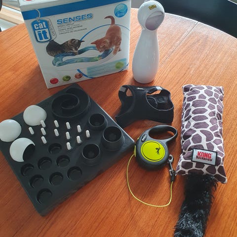 Viisi erilaista suurin osin hyväkuntoista kissan lelua