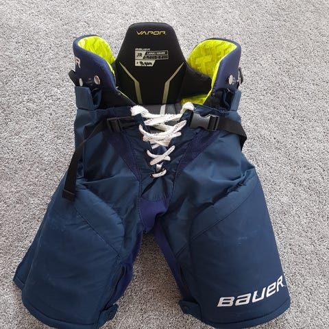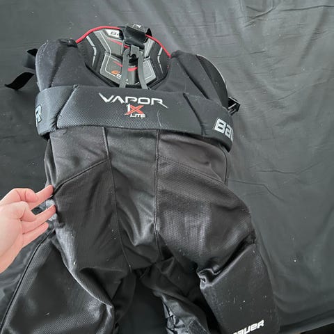 Bauer Vapor 2X jääkiekkohousut musta. Jääkiekkohousuissa on reisien, lantion ja alaselän suojaavat pehmusteet. Malli on suunniteltu jääkiekkokäyttöön ja tarjoaa suojaa ja liikkuvuutta harjoituksiin ja peleihin. Väri on musta, vyötäröllä on kiristysremmit ja nappikiinnitys varusteiden kiinnittämistä varten. KOKO JR XL