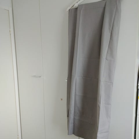 Ikean harmaat (valoisalla hieman sinertävään taittavat) verhot. Verhoja 2kpl. Päästävät valoa lävitseen.