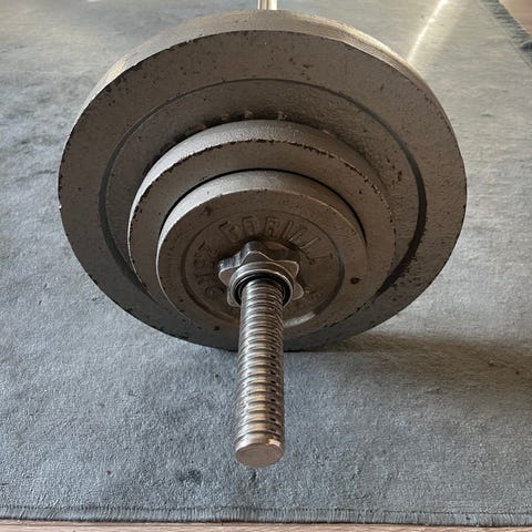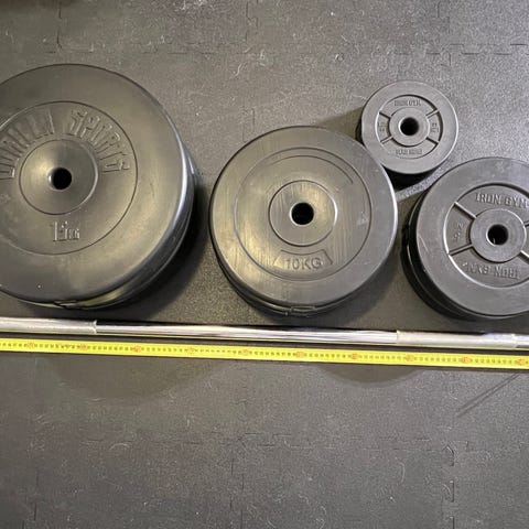 Kierrelukollinen tanko pituus 150cm, paino 6kg. Vinyylipainot 2 X 10kg, 4 X 5kg, 2 X 2,5kg