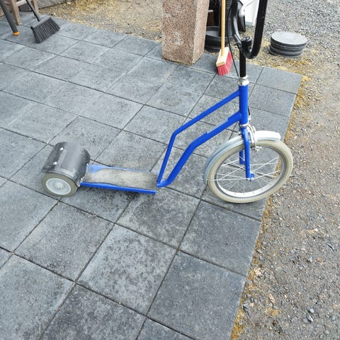 PotkuPeli nelipyöräinen potkulauta, jossa kaksi etupyörää ja kaksi takapyörä. Rungon väri on punainen ja astinlaudat vaaleat, rei’itetyt metallitasot. Potkulaudassa on istuin keskellä runkoa sekä suuri metallinen etukori tavaroiden kuljettamiseen. Ohjaustangossa on käsijarrut molemmilla puolilla. Soittokello. Molemmat etupyörät vuotaa ilmaa, sisäkumit vaihdettava. Astinlaudoissa käytön jälkiä. Potkurollaattori sijaitsee Vesangassa.