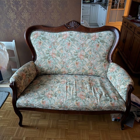 Sohva, lev. 230, syv. 90. Nojatuoli, lev. 104, syv. 90. Rahi minkä sisällä säilytystilaa, lev. 70, syv. 58.