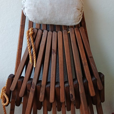 Samaa designia olevat tuoli ja jousitettu rahi korjattavaksi. Tummaksi petsattu Koivu + sininen alkuperäinen verhoilu. Tehty 1930-luvulla Nupposella Lahdessa isovanhempieni häälahjaksi teetetyn makuuhuoneen funkiskaluston osana. Kummankin runko täydessä ryhdissä.