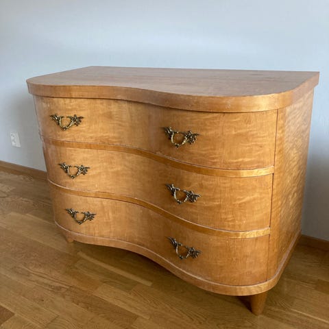 20-30 luvulta senkki koivuvaneri viilulla. Hieno ja jykevä. Rulokaappi toimii ja sen sisällä on vetolaatikot. Päädyissä ovien takana on 2 hyllylevyä. Rulokaappiin on avain ja lukkomekanismi toimii. Päädyn kaappeihin ei ole löytynyt avaimia, mutta ne pysyvät kiinni ilman lukitusta ja ne saa auki.