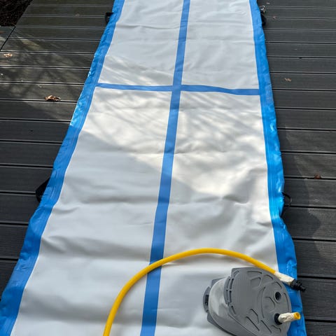 Ilmatäytteinen voimisteluairtrack-matto sisä- ja ulkokäyttöön. Matossa on sininen ja harmaa väritys sekä kantokahvat helpottamaan siirtelyä. Mukana käsipumppu painemittarilla sekä paikkaussarja, johon kuuluu paikkausmateriaalit ja liima. Soveltuu esimerkiksi voimisteluun, temppuiluun ja muuhun harjoitteluun pehmeällä, joustavalla alustalla.