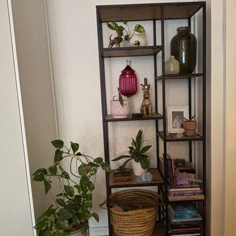Kaunis ja hyväkuntoinen hyllykkö. Yksi pieni kolhu ylimmässä tasossa, näkyy kuvassa.