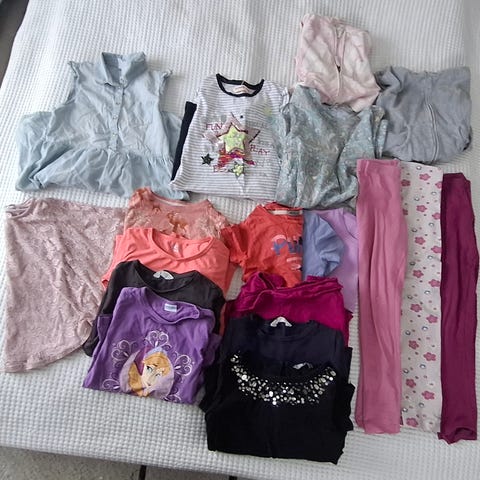 Yhden tytön pääasiassa käyttämiä käyttövaatteita, koot 134-140. Perus siistejä, käytettyjä eli ei täysin uutta vastaavia! En löydä erityisiä erikseen mainittavia vikoja.