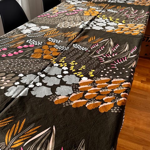 Myydään Marimekon uusi pöytäliina. Koko 135 cm x 250 cm. Materiaali puuvilla.