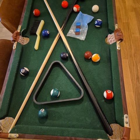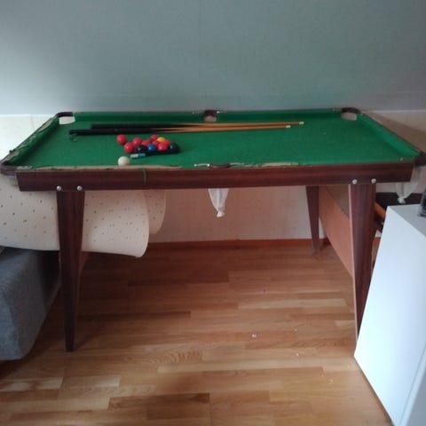 Lasten pöytäbiljardi, kaikki pallot tallella, kaksi mailaa. Pöydässä pieni jälki, näkyy kuvassa.