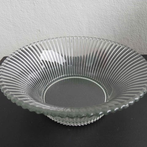 Tarjoilukulho kirkasta lasia, pystyraidallinen uritettu kuvio, loivasti ulospäin levenevä reuna.