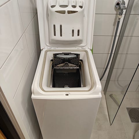 Whirlpool päältä täytettävä pesukone, väri valkoinen. Pesukoneessa on ylhäältä avattava kansi ja rumpu, jonka luukku aukeaa sisäpuolelta. Ohjauspaneelissa on useita pesuohjelmia ja säätimiä eri tekstiilityypeille ja lämpötiloille. Laitteessa on erillinen pesu- ja huuhteluaineannostelija kannen alla. Sopii käyttöön kylpyhuoneessa tai kodinhoitohuoneessa, jossa on rajallisesti lattiatilaa, koska kone on kapea päältä täytettävä malli. Kumitiivisteissä pinttynyttä likaa, mutta ei vaikuta pesuun.