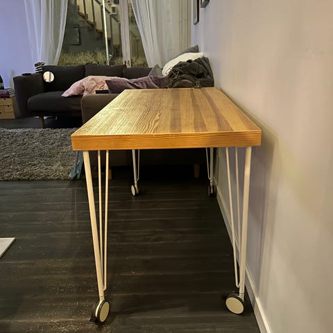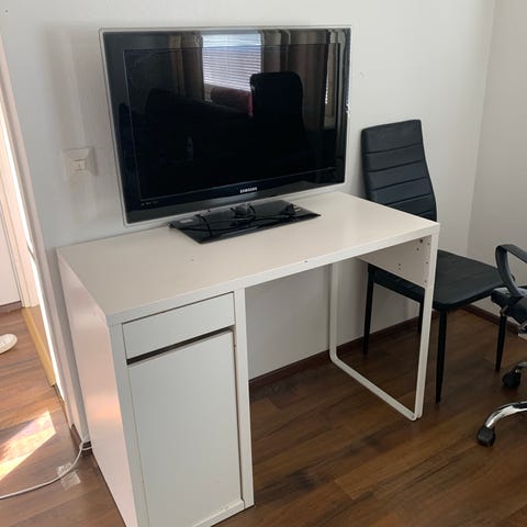 Työpöytä, jossa ulos vedettävä taso näppäimistölle. DC-fixailtu, tukeva, näppärän kokoinen pieneen tilaan. Mitat 40×83×76